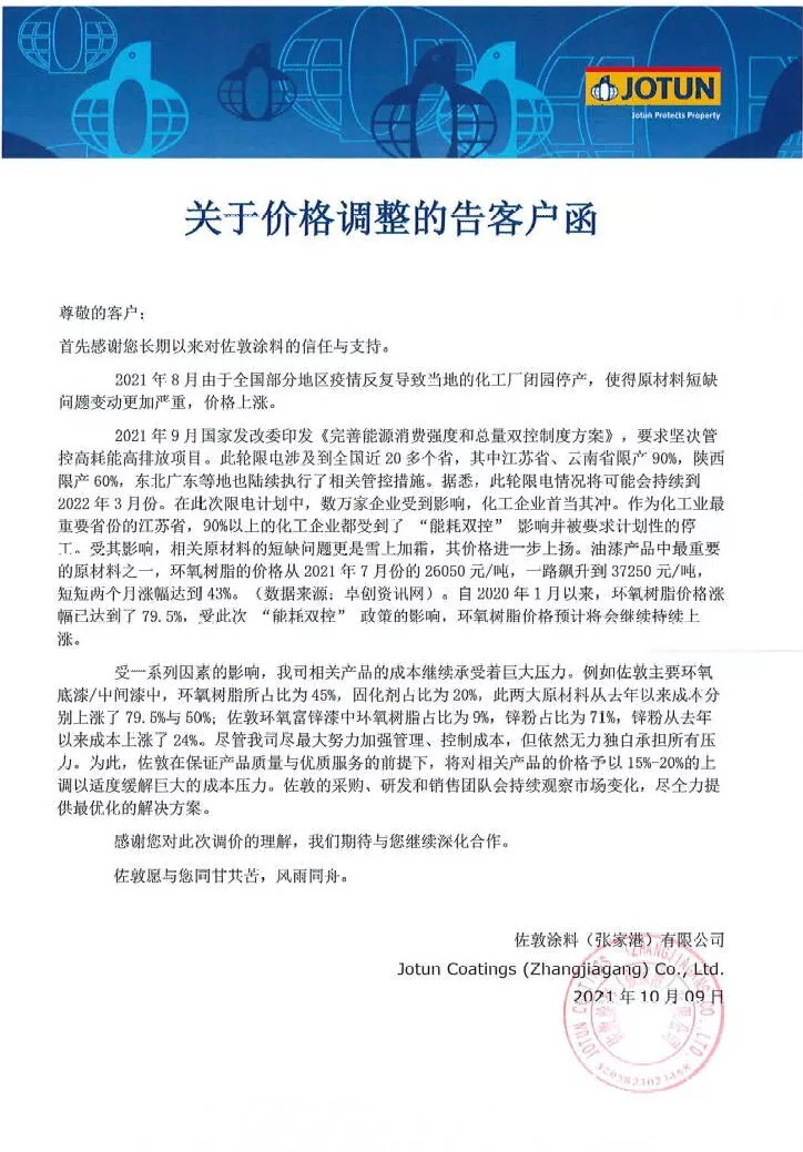 受一系列因素的影響,我司相關產(chǎn)品的成本繼續(xù)承受著巨大壓力。例如佐敦主要環(huán)氧底漆/中間漆中,環(huán)氧樹脂所占比為45%,固化劑占比為20%,此兩大原材料從去年以來成本分別上漲了79.5%與50%;佐敦環(huán)氧富鋅漆中環(huán)氧樹脂占比為9%,鋅粉占比為71%,鋅粉從去年以來成本上漲了24%。盡管我司盡最大努力加強管理、控制成本,但依然無力獨自承擔所有壓力。為此,佐敦在保證產(chǎn)品質量與優(yōu)質服務的前提下,將對相關產(chǎn)品的價格予以15%-20%的上調以適度緩解巨大的成本壓力。佐敦的采購、研發(fā)和銷售團隊會持續(xù)觀察市場變化,盡全力提供最優(yōu)化的解決方案。